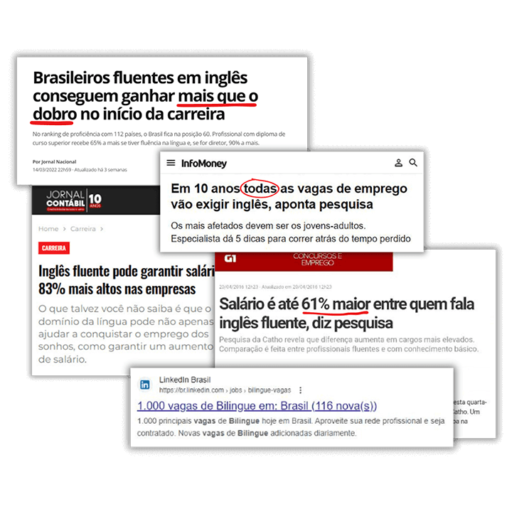 Conforme uma pesquisa publicada pela Catho, ser bilíngue abre uma ampla gama de oportunidades e pode levar a um aumento salarial. Essa diferença pode alcançar até 70%, tornando essencial o domínio do inglês. As possibilidades são ilimitadas!